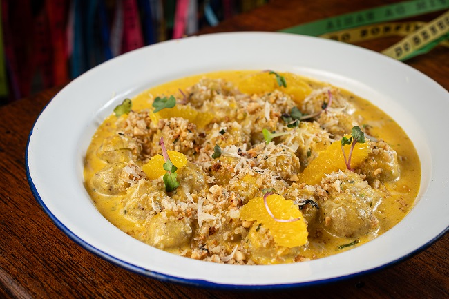 Para o prato principal, também há pratos de terra e de mar, como a costela suína ao molho de tamarindo, com fritas de mandioca (R$ 78 individual; R$ 150 para duas pessoas); o peixe frito com farofa de amendoim, molho lambão, aipim e banana-da-terra cozida (R$ 75 individual; R$ 145 para duas pessoas), o arroz odoyá com frutos do mar (R$ 78); o nhoque de banana-da-terra com camarão ao curry afro-brasileiro (R$ 75) e o nhoque de banana-da-terra vegetariano, com curry afro-brasileiro (R$ 68).