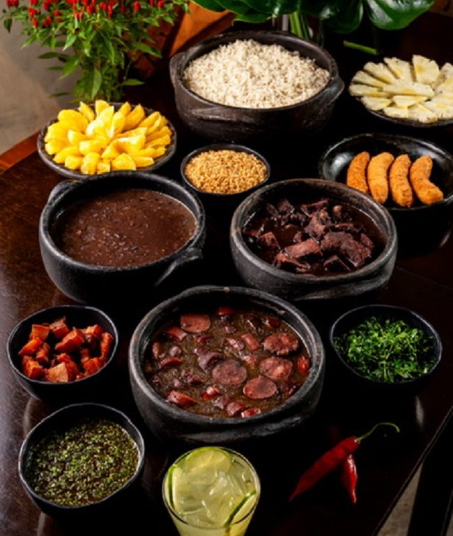O serviço tem, é claro, carne seca, lombo, costela salgada, paio, linguiça fina e calabresa. Para acompanhar, farofa na manteiga, arroz branco, banana à milanesa, couve manteiga fininha, e puxada no alho, além de laranja, pancetta crocante, costela de porco e torresmo. A batida de limão da casa também está inclusa no valor é de R$154 (por pessoa).