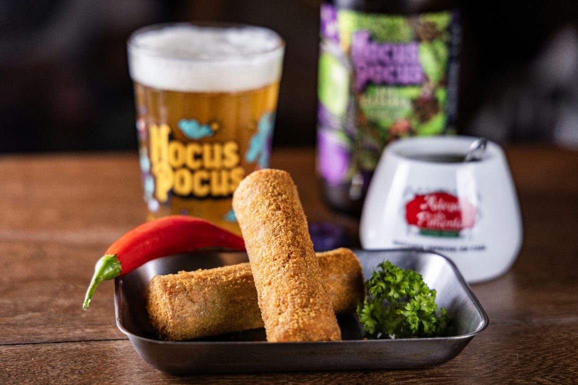 Orange Sunshine da Cervejaria Hocus Pocus + caldinho de feijoada alemã com linguiça de alho e APA Cadabra da Cervejaria Hocus Pocus com Croquete de Carne (2 unidades).