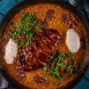Não poderiam faltar as pastas, e dois destaques vão para a coalhada seca com zattar e azeitonas e o homus com carne moída e amêndoas. A Chancliche é uma salada que traz esse queijo temperado artesanal como elemento principal, servido com tomate, cebola, hortelã e salsinha, acompanhado de pão árabe – que não pode faltar numa mesa com esta. Entre os pratos quentes, o Chacrie é uma espécie de estrogonofe árabe de mignon na coalhada com arroz de aletria. Outra receita tradicional da família Mohamed é a paleta de cordeiro desfiada com cuscuz marroquino, assim como o trigo com grão-de-bico com frango ou costela.