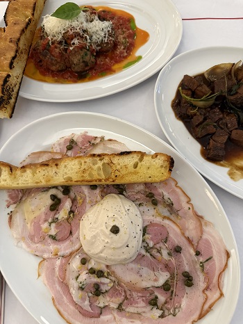 Comi salada Romanov, de cavaquinha com batata frita, recomendo que provem. Também língua ao molho. Recomendo que experimentem. Também teve porchetta tonnata, ou seja, leitão fatiado ao molho cremoso de atum; e ainda um lindo prato de almôndegas ao sugo.