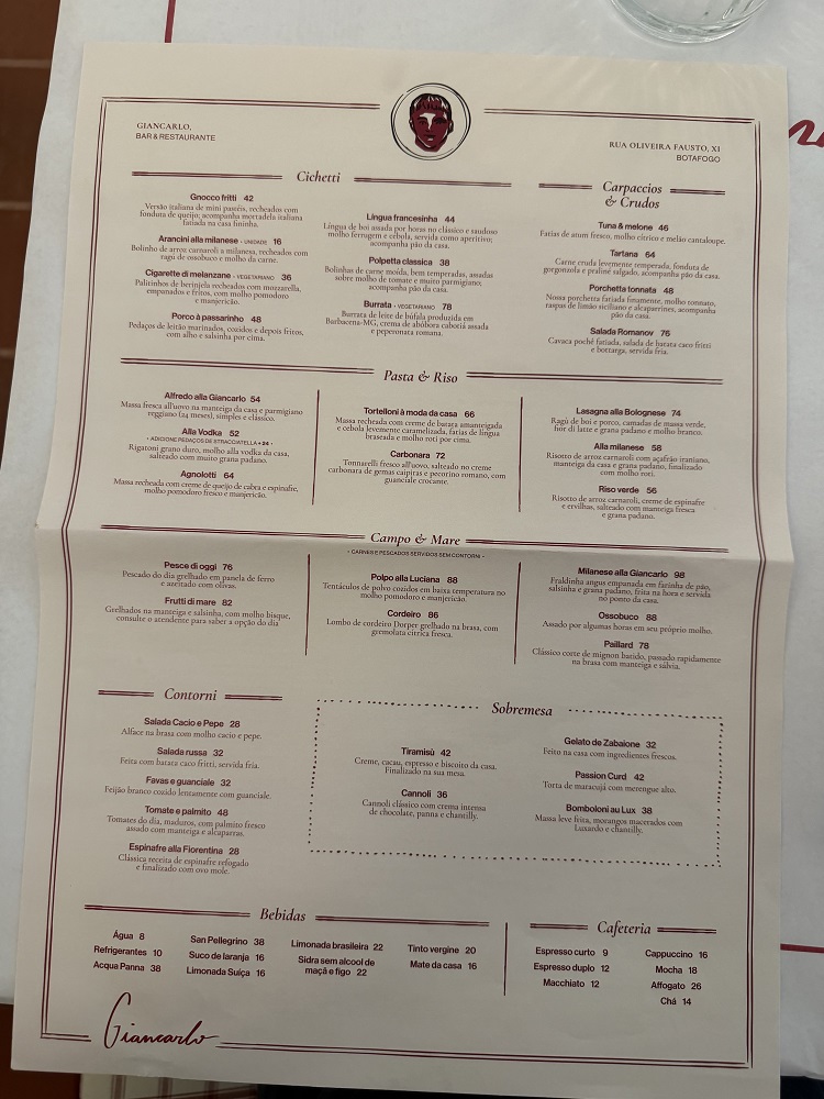Eu realmente fui levado a um tempo que já não existe senão nas lembranças: Rio de Janeiro, anos 1980. O Giancarlo é um restaurante de 1985, mas que nasceu em janeiro de 2026.
