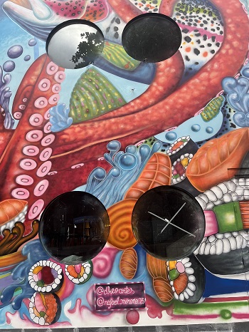 A fachada vem chamando a atenção de quem passa ali, pelo Largo dos Leões, na esquina com a Rua Marques, na lateral da Cobal do Humaitá. Ela foi inteiramente grafitada por Rafael Moreno (@rafael_moreno_23) com temas japoneses, destacando sushis, e elementos marinhos, como um grande polvo e peixes, numa obra em grande formato, e muito colorida. As janelas são redondas, como se fossem escotilhas náuticas. Do lado de dentro também chama a atenção a decoração, que repete os mesmos padrões: estética nipônica, cores vibrantes e temática que remete ao mundo dos sushis, sashimis, nigiris e afins, e aos peixes e frutos do mar.