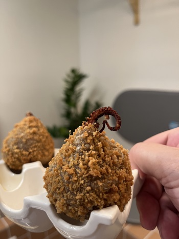 Fiquei feliz em saber que a famosa coxinha de polvo, que só está servida às quartas, agora está no menu regular, em versão menor, para a gente poder comer mais de uma.