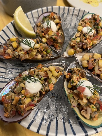 Em seguida, um dueto de conchas, com lambretas à francesa, que vão ao forno com manteiga de ervas, à la Bourgogne, com alho e salsinha; e mais mexilhões, dessa vez com